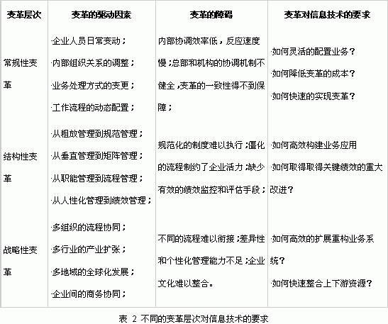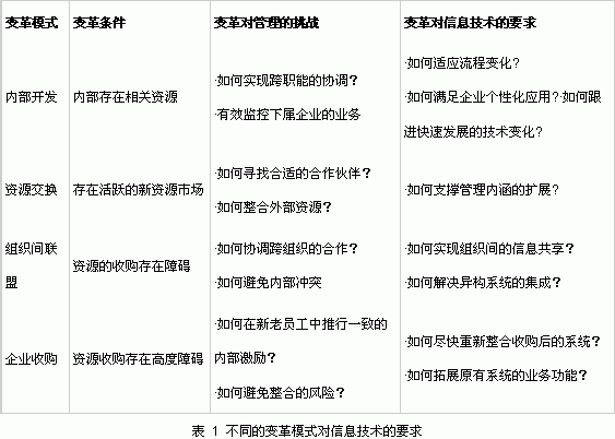 首先,從變革的過程來看,集團化是任何一個希望做大做強的企業(yè)必然經歷的過程。企業(yè)的變革模式主要有四種,即內部開發(fā)模式、資源交換模式、組織間聯(lián)盟模式、企業(yè)收購模式。這四種變革模式各有其獨特的優(yōu)勢,同時又面臨著不同的風險,但是都對信息技術提出了自己的要求。如下表所示: