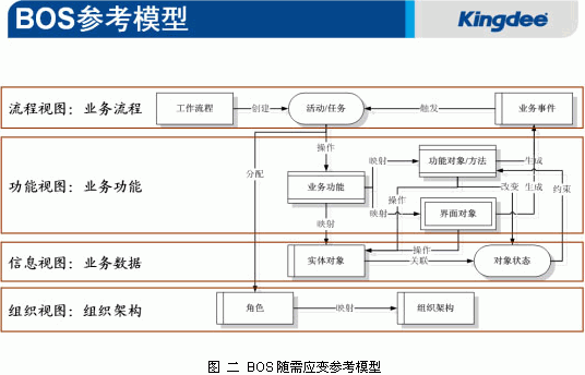 最后,金蝶EAS模型驅動架構通過 BOS為復雜的業(yè)務邏輯提供了驅動引擎。這套引擎為業(yè)務變革到系統(tǒng)變更提供了一套隨需應變的規(guī)則。一個工作流程在金蝶EAS中進行了變更,相應的流程控制邏輯、業(yè)務控制邏輯、信息處理邏輯、組織協(xié)同邏輯都會隨之改變。驅動引擎的作用,一方面是幫助企業(yè)將復雜的業(yè)務邏輯進行分解,一方面實現(xiàn)了從上到下的流程驅動。只要給出業(yè)務變革的輸入要素(5W1H),驅動引擎就可以保證該變革可以有條不紊的完成。這就是金蝶所稱的BOS隨需應變參考模型見下圖所示: