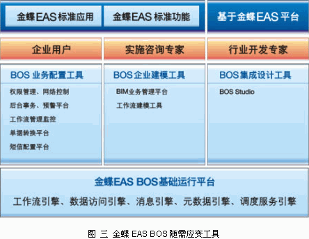 用戶最為關心的應該是究竟如何使用金蝶EAS實現(xiàn)集團管理的隨需應變。金蝶針對集團企業(yè)集團企業(yè)復雜的管理和變革要求,給出了一套支持企業(yè)不同變革道路、不同變革模式、不同變革層次的隨需應變解決方案——金蝶EAS BOS。金蝶EAS BOS針對企業(yè)漸進式變革道路,提供了不同層次的變革支持工具,全面解決企業(yè)不同變革模式的信息化問題。
