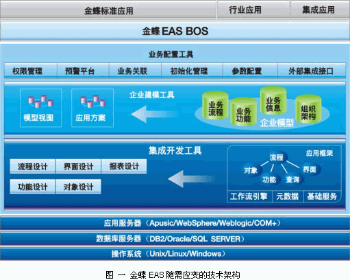 金蝶EAS正是憑借獨有的基礎中間件和業(yè)務中間件技術從下到上實現(xiàn)了管理軟件的隨需應變的技術架構,見下圖所示: