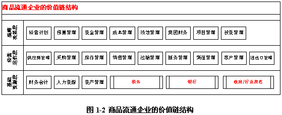 用友ERP-U8的應用設計基于優化后的企業價值鏈結構, 將工業企業和商品流通企業的價值鏈結構,系統地創新性地組織優化之后,如圖(1-1)和(1-2)所示。