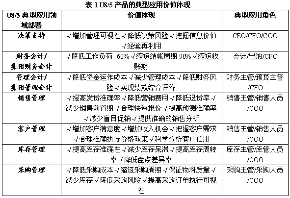 用友ERP-U8產品,全面支持離散制造、流程制造、商品流通、服務業、行政事業、國防航空等行業企業的經營管理運作和戰略決策支持。產品典型功能領域的價值體現,如表(1)所示。