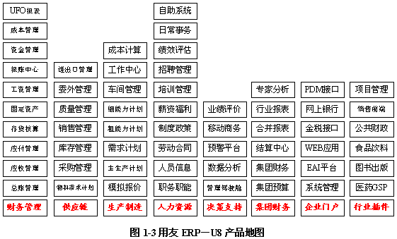 用友ERP-U8適應的行業類型主要包括:制造生產、商品流通、服務行業、集團型企業、行政事業及國防航空等,其軟件產品地圖,如圖(1-3)所示。