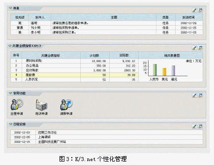 面向用戶的個(gè)性化管理:K/3.net系統(tǒng)通過(guò)界面的定義、意外事件的預(yù)警定義、資料與單據(jù)的定義、應(yīng)用邏輯的定義等等來(lái)實(shí)現(xiàn)個(gè)性化的支持。基于對(duì)象構(gòu)造模型的可重構(gòu)設(shè)計(jì)以及業(yè)務(wù)流程的清晰劃分保證了用戶個(gè)性化的特色需求。特別需要指出的是,K/3.net是提供給管理者的一個(gè)貼身的戰(zhàn)略武器,包括企業(yè)的決策者和管理者。