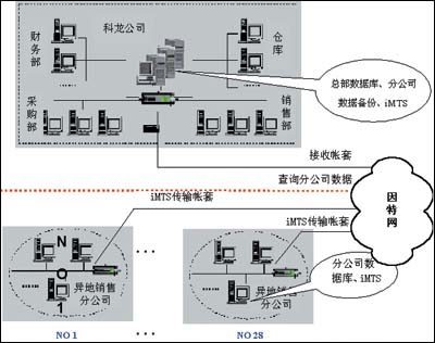 金蝶方案:根據科龍公司的實際情況,金蝶設計了分布式解決方案(見圖2),即:科龍總部服務器存放總部財務數據以及各分公司財務數據備份;分公司按照總部的需求,定時將財務數據備份到總部服務器上;總部查看分公司歷史數據或對歷史數據進行合并、分析時,可以通過內部網絡查看總部服務器上的各分公司的備份數據,操作方便快速;總部查看分公司即時數據時,可通過撥號,與分公司服務器連接,查看分公司即時數據,做到即時監控,減少費用;各分公司設立服務器,財務數據存放在當地,按照總部要求,定時將財務數據通過金蝶iMTS遠程傳輸工具備份到總部服務器,各分公司日常操作本地服務器上的賬套。