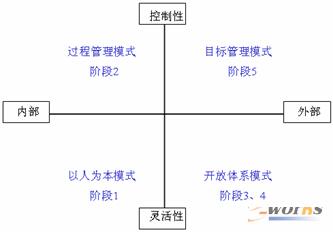 從縱坐標看,越往下走越來越強調靈活程度,體現了管理的柔性;越往上走控制力度越大,體現了管理的剛性。從橫坐標看,越往右走就越強調管理的開放程度,往左走更偏重于內部管理。成長性企業(yè)發(fā)展第一階段的管理模式,可以稱之為以人為本,僅透過創(chuàng)業(yè)者本人就可驅動企業(yè)的發(fā)展,體現了最大程度的人性化和自由度;第二個階段的重心是過程管理,需要有一個規(guī)范化的管理體系和業(yè)務流程;第三和第四階段,由于管理彈性增加、強調合作與開放,處在這兩個階段的管理模式可以統稱為開放體系模式;第五個階段,更是目前絕大多數中國企業(yè)遠未達到的境界,就是以目標為導向的管理模式,簡稱目標管理。