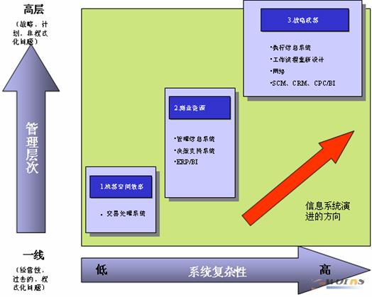 從上圖我們可以看到,信息系統隨著復雜程度越來越高,它為企業(yè)管理的層次,特別是為高層管理提供的服務就更有價值。在信息系統復雜程度較低的時候,它一般處理一些事務性交易,目的是提高企業(yè)的工作效率,這是成長性企業(yè)在第一、二階段特別需要解決的問題。企業(yè)發(fā)展到第三、第四階段,需要把信息系統當作一種商業(yè)資源,尤其需要管理信息系統方面的東西,如ERP、CRM、EIS等,因為企業(yè)跨越第二個發(fā)展鴻溝后,客戶會越來越多,面對一個更為龐大的主流市場,需要運用客戶關系管理的手段,并創(chuàng)造業(yè)務差異化的最大優(yōu)勢。當企業(yè)發(fā)展到第四或者更高階段之后,就需要一套戰(zhàn)略管理系統,這時的信息系統應該變成一種戰(zhàn)略武器。所以信息系統隨著復雜性地不斷衍進,能夠幫助成長性企業(yè)不斷創(chuàng)造出變革的優(yōu)勢。
