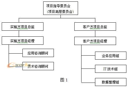 建議組織架構如圖1所示,項目指導委員會由雙方的高層領導組織,亦稱項目高層委員會,其職責是保證客戶和實施方高層的直接溝通,建立良好的合作關系。