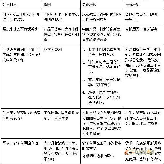 項目風險即項目實施過程中的不確定性,就是投入資源以后沒有如期實現目標,包括實施進度、回款、客戶滿意度和市場影響;ERP項目在國內少有成功的案例,說明了它存在的巨大風險。公司高層、銷售人員、項目經理和實施顧問都必須有很強的風險意識,采取有效措施、減少和規避風險。項目風險控制的任務一是要防止和規避風險,二是在意外事件發生時,如何應對,將影響減少到最低。