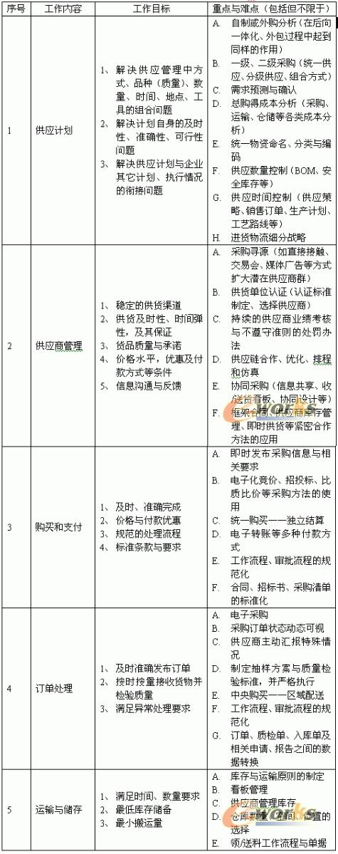 知道了供應工作有哪些內容,有哪些績效標準,我們就可以對企業供應管理的工作目標、工作中的重點與難點進行一個簡單的描述,如表一:
