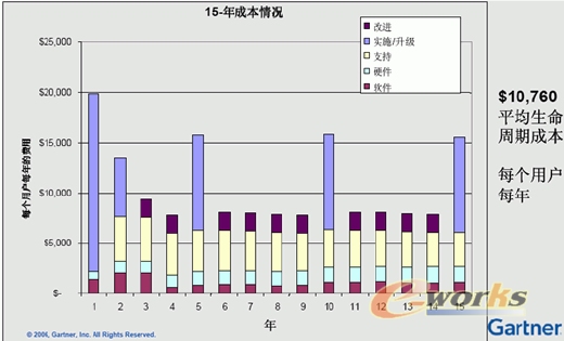 管理業務應用組合的成本仍然很高,企業為維護ERP等企業信息系統的正常運行,不得不付出高昂的費用。下圖是Gartner對最近十五年來企業在信息系統上年成本的調查情況。