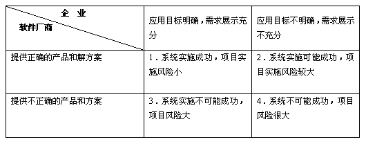 上表中不僅僅說企業(yè)“需求明確”,而且使用了“企業(yè)充分展示需求”的說法,二者的區(qū)別是前者僅僅是企業(yè)單方面的需求明確,后者是企業(yè)不僅有明確的需求,還包括企業(yè)為軟件廠商提供了相應的條件,讓軟件廠商獲得了明確的需求,我們可以看到這之間是決定性的差別存在的,二者的差距是導致現(xiàn)實中ERP項目難以成功的一個大障礙(后面闡述)。上面四種情況含義: