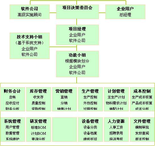 實(shí)施ERP系統(tǒng)有大量的工作要做;管理改革也要配合進(jìn)行。為了保證項(xiàng)目按計(jì)劃進(jìn)度順利實(shí)施,首先要組織落實(shí)。通常要成立三級(jí)項(xiàng)目組織,即項(xiàng)目領(lǐng)導(dǎo)小組、項(xiàng)目實(shí)施小組和項(xiàng)目應(yīng)用小組。