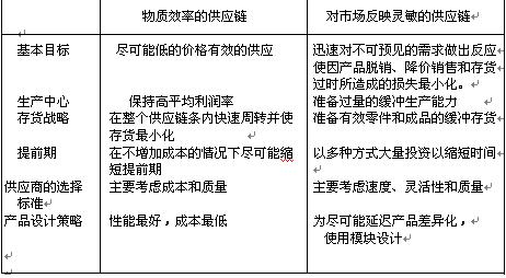 第三,設計供應鏈要根據本企業的行業特性來選擇。費希爾在《哈佛商業評論》中給出一個供應鏈選擇戰略。他認為,存在兩種供應鏈,即具有物質效率的供應鏈和對市場反映靈敏的供應鏈。兩種供應鏈的特點如圖二。對于功能性產品,即那些滿足基本需求、需求穩定且可以預測、生命周期長的產品,如大型零售商、加油站等,比較適合建立具有物質效率的供應鏈;對于創新產品,即那些只有在產品樣式或技術上不斷進行創新,才能促進產品銷售,提高企業利潤率水平的行業,如流行服裝業和電腦業等,比較適合建立市場反映靈敏的供應鏈。