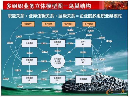 在U9系統中我們還可以建立組織之間的上下機構層級的關系,剛才講到了,組織之間有不同職能之間的關系、業務邏輯關系、層級關系,通過這樣的關系,我們可以看到企業可以實現多組織的業務模式,這種模式應該說是錯綜復雜的,而我們在現實中企業也是遇到的這樣的模式,我們稱之為“鳥巢式”的模式。