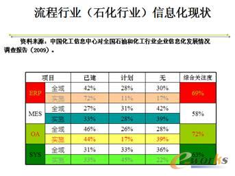 這個數據是來源于我們的行業協會提供的一個數據。相對來說,流程行業一般企業規模都比較大,信息化的基礎相對比較好,走在其他行業的前列,通過表格可以看到,流程行業已經應用了哪些系統。在當今無論是ERP還是大家剛才介紹的生產管理控制系統,這些在流程行業都有深入的應用。從圖上還能看到截止到2009年底流程行業的總的態勢和水平,已不僅僅滿足于簡單的財務這樣一個應用。