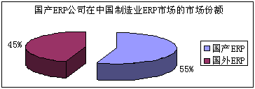 從國內(nèi)、外ERP軟件公司的市場占有率來看,國外軟件在高端市場上占據(jù)了優(yōu)勢,而國產(chǎn)軟件則在廣大的中小企業(yè)上有絕對優(yōu)勢,用友、金蝶等廠商在該市場的收入遠(yuǎn)遠(yuǎn)超過國外廠商。2004年,我國ERP軟件廠商的營業(yè)額占整個中國制造業(yè)ERP市場的55.18%。