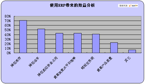 從ERP軟件的整體效益方面,最顯著的效益是降低庫存,其次為降低成本。同時也給部分企業(yè)降低了流動資金占用、提高決策水平和效益、縮短交貨期、提高產(chǎn)品質(zhì)量等效果。整體上看,ERP系統(tǒng)已經(jīng)幫助中國制造企業(yè)取得了實實在在的應(yīng)用效果。
