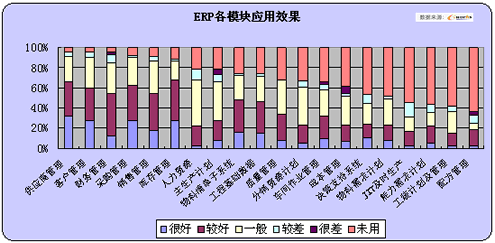 從制造業(yè)ERP的整體效果來看,財務(wù)與物流模塊的應(yīng)用效果相對較好,至少不少企業(yè)通過實施該系統(tǒng)初步理順了物流和資金的情況,初步做到了實物帳與財務(wù)帳的統(tǒng)一,此外供應(yīng)商管理、客戶關(guān)系管理等模塊的應(yīng)用效果較好,生產(chǎn)管理與成本管理則應(yīng)用效果一般,而人力資源、分銷管理等模塊由于軟件所提供的功能相對簡單,沒法滿足企業(yè)深層次的應(yīng)用,應(yīng)用深度不夠,企業(yè)的整體滿意度也不高。