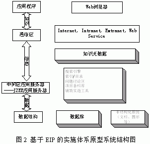 有關文獻表明,企業信息門戶(Enterprise Information Portal, EIP)是實現知識管理的最合適的技術[6]。從知識管理系統的角度來看,EIP是Intranet進化的結果,因為Intranet不能從不同的數據源收集數據,并且也很難將信息清晰簡潔的顯示給用戶。圖2是基于EIP的實施體系原型系統結構圖。