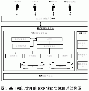目前,ERP項目的實施成功率主要取決于實施人員的經驗,同樣的ERP系統,不同的實施人員實施小過可能差別很大,如何建立一個輔助實施系統,提供給實施人員、開發人員和系統應用客戶一個實施工作平臺,將有經驗的實施專家的實施經驗轉化為集體的經驗,是ERP供應商和ERP咨詢公司都關心的一個問題。圖1中給出了一個基于知識管理的ERP輔助實施體系。