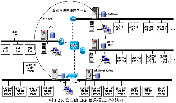 在圖1.2中,從應用角度來講:OA系統是整個集團公司企業管理標準資料、技術文檔、信息發布——稱之知識共享平臺,電子商務可以是公司對外或者對內交易的信息共享平臺,CAD/PDM、CAPP是公司的產品設計信息共享平臺;MRPII是公司的制造管理信息共享平臺。