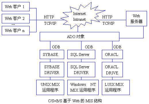 通過比較發(fā)現(xiàn),B/S具有許多C/S說沒有的優(yōu)點(diǎn),但是由于目前的B/S開發(fā)工具還不夠成熟,所以B/S得成本相對要高。對于企業(yè)的B/S應(yīng)用,從當(dāng)前技術(shù)水平看,特別適用于系統(tǒng)統(tǒng)用戶交互量不大的應(yīng)用,對于要求高速、頻繁交互的模式則采用C/S體系,所以兩者的應(yīng)用時(shí)相互補(bǔ)充的。這種混合模式是企業(yè)應(yīng)用最大的模式,其基于Web的管理信息體系流程圖如下: