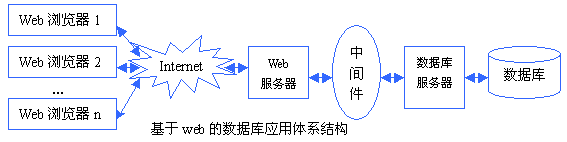 Web系統(tǒng)的基礎(chǔ)模式是三層體系結(jié)構(gòu)的B/S。第一層是用瀏覽器完成用戶的接口功能;第二層由各種服務(wù)器完成用戶所需的服務(wù)功能;第三層有由數(shù)據(jù)服務(wù)器完成數(shù)據(jù)存儲和管理功能。基于web訪問數(shù)據(jù)庫的應(yīng)用通常包含以下4部分的內(nèi)容:web服務(wù)器、web瀏覽器、數(shù)據(jù)庫服務(wù)器、中間件(如路由器,集線器等),其體系結(jié)構(gòu)如下圖: