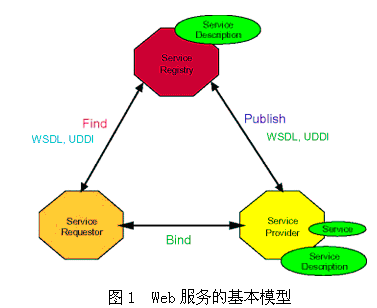Web服務(wù)的實(shí)現(xiàn)包括服務(wù)描述、發(fā)布和實(shí)現(xiàn)。WSDL作為服務(wù)描述語言,私有的UDDI注冊(cè)中心作為服務(wù)發(fā)布和發(fā)現(xiàn)的方式,XML、SOAP、HTTP作為消息傳遞的格式和協(xié)議。其中包括三個(gè)角色: