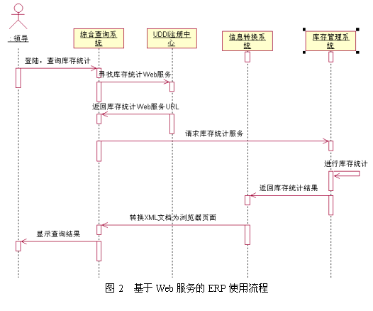 按照上述部署步驟,綜合查詢系統(tǒng)、企業(yè)信息門戶與ERP系統(tǒng)的集成通過Web服務(wù)連接起來。例如,領(lǐng)導(dǎo)要通過綜合查詢系統(tǒng)查詢ERP系統(tǒng)中的庫(kù)存統(tǒng)計(jì)信息,這個(gè)查詢過程通過Web服務(wù)實(shí)現(xiàn)流程如下: