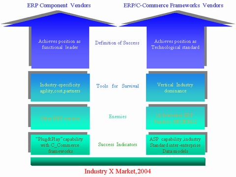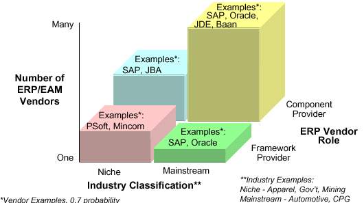 隨著ERP迅速轉化為商品,進行縱向聯盟將成為當今多數ERP提供商的生死存亡的問題。Ccommerce的興起,以及隨之產生的提供商在縱向行業中的兩分化(一類提供架構,另一類提供要件),使得提供商的風險增加。他不只是對參與何種縱向行業進行選擇,還必須決定他們將支持何種商業流程以及在這些縱向行業中他們將扮演何種角色。到2004年,將不會有CRM或SCM提供商進入ERP市場(概率為0.6)。