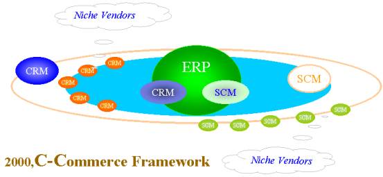 Ccommerce將加劇而不是消除提供商在企業商務應用軟件領域中為爭奪領導地位而開展的戰爭。現在ERP仍然固守其作為企業應用的中心地位。現在在企業應用提供商之間的競爭從提高效率和后臺辦公轉向了有效性和前臺辦公。盡管傳統的ERP在削減成本方面仍是主要的功能,但它無助于進一步提高企業的競爭力。為了使得企業更具競爭力,ERP提供商正努力收購、研制或者合伙,以使得他們的產品具有供應鏈管理(SCM)和客戶關系管理(CRM)的功能。但是他們的商業模型和交易導向的架構的設計阻礙了他們在未來五年內超越領先的提供商。那些與其他提供商合作以開發SCM和CRM功能的ERP提供商將處于更加不利的地位。SCM和CRM提供商在這一領域的能力還較弱,它們可能會失敗或成為收購的對象。Ccommece的框架將獲得應有的位置,而處于領先地位的ERP、SCM和CRM提供商將在未來五年內提供這些架構。