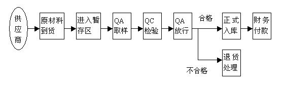 在業務層面出現的需求和問題,大多是各部門正常的業務流轉的一些需求,這些需求整理起來比較容易,而且在一般的ERP軟件中都可以滿足,這里值得注意的是:企業本身的需求是自身個性需求與行業共性需求的交匯。每個企業都已按照自己行業內的一些規范制定了許多的制度,而且有許多業務的流程與行業內的許多公司相似,同時每個企業因為所處的地域和環境不一樣,發展的歷史不一樣,所造就的企業文化是不一樣,這就產生了企業的個性需求。比如:A制藥廠原先屬于集團下的一個車間,現發展成為一個獨立的企業,并且在某開發區內新建了廠房,購置了先進的生產和檢測設備,躍然成為一個嶄新的工廠,這就是他自身的歷史。A制藥廠作為一個制藥企業,必須通過GMP認證,并且按照GMP的要求制定采購流程,質量檢驗流程,產品出庫流程,倉庫管理和銷售管理等,這既是國家藥監局對制藥行業的要求,也是行業內的規范和制度。A藥廠的ERP項目經理在咨詢顧問的指導下,仔細分析了企業自身的特點后,做出了既有行業共性和自身個性的管理需求分析報告。比如:A藥廠在原材料采購的流程需求分析中就重點考慮了兩點:1、A制藥廠原先屬于集團下的一個車間,采購是集團統一做的,現在需要對供應商,供應商的供貨情況,供應商的信譽等進行管理;2、GMP規定中對于原材料的質量要求非常嚴格,堅決杜絕不合格的材料進入車間。在分析需求的基礎上,繪制的采購流程圖如下所示: