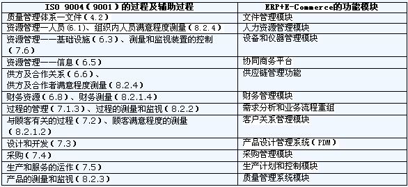 ISO 9004標準中的以下條款對應了企業的一組實際運作過程或輔助過程:文件(4.2);資源管理(6.包括:人員、基礎設施、信息、供方和合作關系、財務資源);過程的管理(7.1.3);與相關方有關的過程(7.2);設計和開發(7.3);采購(7.4);生產和服務的運作(7.5);測量和監視裝置的控制(7.6);產品的測量和監視(8.2.3),下表給出這些過程與ERP+E-Commerce的實現功能之間的對應點(為了便于操作和比較,有些過程和部分涉及到“相關方”的過程是采用ISO 9001的要求;“協同商務平臺”和“產品設計管理系統”是信息技術的應用功能):