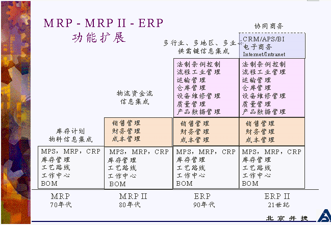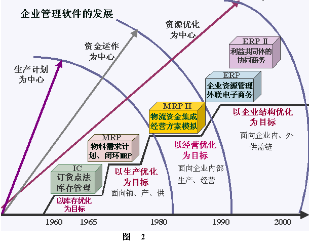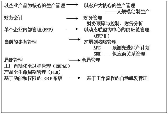 借用ERP資深專家陳啟申老師的一幅圖(圖3),清晰地描述了從MRP到ERPⅡ的發展過程。可以看出,ERP系統不是突然冒出來的,它是在MRP、MRPⅡ的基礎上發展起來的。MRPⅡ包含了MRP的功能,又增加了財務會計和管理會計的功能;而ERP包含了MRPⅡ的功能,又增加了供需鏈的管理,也就是超出企業內部管理的功能。正在發展的ERPⅡ既包含了ERP的功能,又增加了協同商務所必須的技術和相應的功能,突出在異構平臺之間的信息集成。