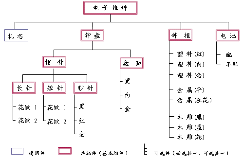 圖2是一個(gè)以電子掛鐘為例的模塊型產(chǎn)品結(jié)構(gòu)。掛鐘簡(jiǎn)化為由機(jī)芯、鐘盤、鐘框和電池四個(gè)部件組成,其中機(jī)芯是通用件,所有掛鐘都要采用,沒有可選問題。鐘盤、鐘框可以有各種選項(xiàng)(如顏色、造型、材質(zhì)等),供客戶選擇,但必須任選其一,而電池是可選或不選的可選件。這些可選的物料可以是企業(yè)自己生產(chǎn)的,也可以是由合作伙伴提供的。