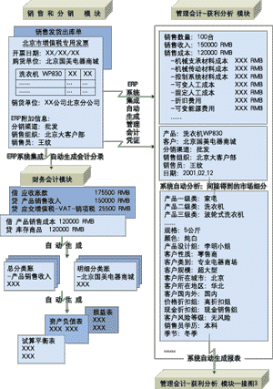現(xiàn)在讓我們先看一下這張管理會(huì)計(jì)憑證所包含的內(nèi)容。從圖2中可以看到,憑證的第一段記錄了銷售數(shù)量、銷售金額和銷售成本的值,其中成本更是被細(xì)致地分析出各類原材料、人工和制造費(fèi)用的構(gòu)成。產(chǎn)品成本構(gòu)成的數(shù)據(jù)來(lái)源于ERP中生產(chǎn)和產(chǎn)品成本模塊(我們將在下期文章《ERP中的企業(yè)預(yù)算》中詳細(xì)闡述)。此時(shí)成本構(gòu)成的數(shù)字被直接用于管理會(huì)計(jì)憑證的生成。在憑證的第二段中我們看到系統(tǒng)直接從發(fā)票和出庫(kù)單中分析出的一些基本市場(chǎng)細(xì)分信息,如產(chǎn)品、客戶、銷售組織、銷售員等等,其中像公司內(nèi)部銷售組織之類的細(xì)分,不會(huì)在對(duì)外的發(fā)票中體現(xiàn),但在ERP系統(tǒng)內(nèi)部的發(fā)票中記錄了這些信息。憑借這些基本的市場(chǎng)細(xì)分信息,系統(tǒng)根據(jù)我們前文所提的推導(dǎo)規(guī)則自動(dòng)分析,得出了其他的細(xì)分標(biāo)準(zhǔn)。比如根據(jù)客戶檔案和產(chǎn)品主記錄系統(tǒng)將這筆銷售歸入了北京專業(yè)電器商場(chǎng)這一市場(chǎng)和李明開發(fā)小組,同時(shí)這筆銷售也是對(duì)高折扣類客戶的銷售,而產(chǎn)品又是洗衣機(jī)類產(chǎn)品等等。這樣,通過(guò)系統(tǒng)的集成和分析功能,一筆銷售被非常全面細(xì)致地記錄了下來(lái)。而通過(guò)ERP中的“穿透報(bào)表”(Drill down report)功能和科學(xué)的解決問題方法,管理人員可以解決很多企業(yè)經(jīng)營(yíng)管理中的問題。在這里需要重申的是,本文中的細(xì)分標(biāo)準(zhǔn)只是一個(gè)例子,實(shí)施中企業(yè)的實(shí)際情況才能最終定義細(xì)分標(biāo)準(zhǔn)的特性。