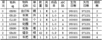 當然,這并不是我們最終所要的BOM。為了便于計算機識別,必須把產品結構圖轉換成規范的數據格式,這種用規范的數據格式來描述產品結構的文件就是物料清單。它必須說明組件(部件)中各種物料需求的數量和相互之間的組成結構關系。下表就是一張簡單的與自行車產品結構相對應的物料清單。