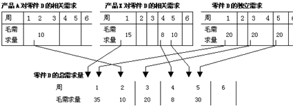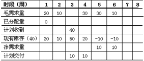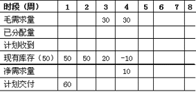 以上計算過程表明雖然1,2,4,6周均需要A,但實際A只要3及4周交付10個即可以了。這個計劃下達時間和數量就是部件B和C的毛需求的時間和數量。