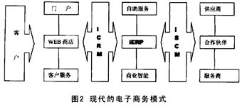 圖2顯示的是真正的在線交易模式(BOL)。從客戶到供應(yīng)商完全連通,企業(yè)內(nèi)部流程與外部交易完全一體化。通過客戶關(guān)系管理(iCRM)實(shí)現(xiàn)與客戶的互動(dòng)營銷:研究消費(fèi)行為,前瞻性、全局性銷售預(yù)測;形成一對(duì)一的有效目標(biāo)市場,發(fā)掘客戶價(jià)值;幫助客戶自助服務(wù);集成呼叫中心(CallCenter),實(shí)現(xiàn)服務(wù)快速響應(yīng)。