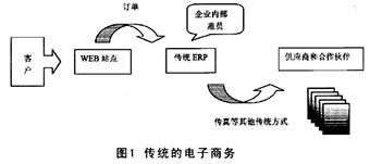 而電子商務(wù)的本質(zhì)是企業(yè)利用電子方式在客戶、供應(yīng)商和合作伙伴之間實(shí)現(xiàn)在線交易、相互協(xié)作和價(jià)值交換。圖1(以B2C為例)為企業(yè)的目前模式,客戶可以在網(wǎng)站下達(dá)成訂單,并傳遞至ERP系統(tǒng)(有些傳統(tǒng)ERP可接受電子訂單),而企業(yè)與供應(yīng)商及合作伙伴之間的采購請(qǐng)求、外協(xié)外制、貨物供應(yīng)、產(chǎn)品配送等仍然是通過傳統(tǒng)方式,未能實(shí)現(xiàn)網(wǎng)絡(luò)化,游離在交易鏈之外。