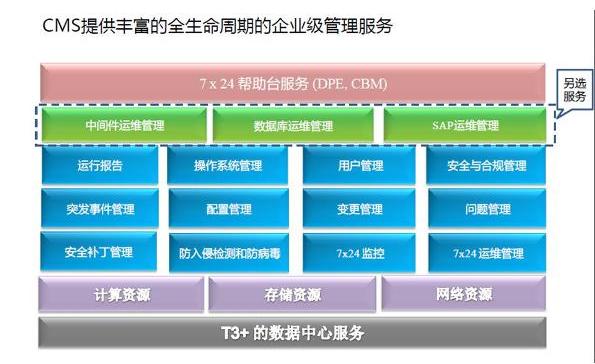 具體來看,傳統(tǒng)大中型企業(yè)在應用其他云服務時,并不包括補丁管理、配置管理、變更管理、安全與合規(guī)管理等運維模塊,而這些企業(yè)又不可能具有互聯(lián)網(wǎng)企業(yè)的技術(shù)實力去自如實施自助服務,這就造成服務體驗大打折扣,甚至會影響業(yè)務正常運行。而CMS中的運維服務管理源于IBM二十年來的外包服務經(jīng)驗,或者說,IBM就是把企業(yè)外包服務體系從企業(yè)內(nèi)部的數(shù)據(jù)中心按照運維管理服務模式全部“搬到”CMS云環(huán)境中,這無疑對原有的企業(yè)應用有很好的傳承性,將有效保證企業(yè)級云服務的應用效果。此外,中間件、數(shù)據(jù)庫以及ERP/CRM等PaaS層的運維服務,也是CMS與一般公有云的顯著區(qū)別,如圖3所示。