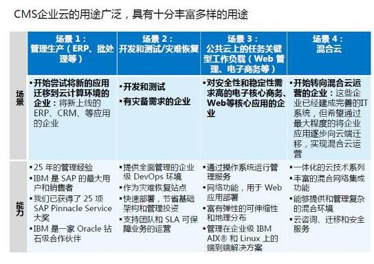 值得一提的是,那些對橫向拓展要求較高,彈性計算資源伸縮幅度較大的企業(yè)應用,并不適合CMS,穩(wěn)定高效、高安全性企業(yè)級關(guān)鍵應用即服務才是CMS的重點。那么CMS到底面向哪些企業(yè)、哪些行業(yè)?IBM對此總結(jié)出四個主要的應用場景,如表1所示:
