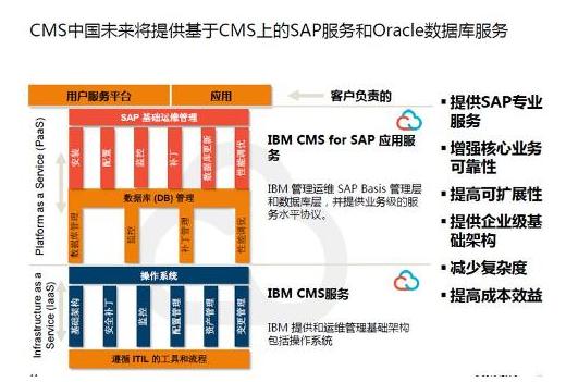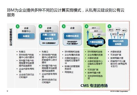 另一方面,IBM一直為傳統(tǒng)大中型企業(yè)客戶提供復雜服務,以滿足關(guān)鍵業(yè)務與核心應用的需求,“IBM即服務”闡述的就是IBM的核心能力與發(fā)展方向。當IBM提供企業(yè)級的云服務時,企業(yè)級的技術(shù)能力、長期的外包服務經(jīng)驗,以及對企業(yè)行業(yè)應用的理解都是互聯(lián)網(wǎng)云服務商所不能比擬的優(yōu)勢。因為,最基本的企業(yè)需求沒有變,無論數(shù)據(jù)中心資產(chǎn)是否屬于企業(yè)用戶,云服務提供商都一樣需要圍繞計算、存儲、網(wǎng)絡(luò)、安全四大基礎(chǔ)元素,改變的僅僅是交付方式。應該說,云服務不僅可以用來支持Web、移動等新型應用,也可以支持開發(fā)測試、異地災備,還應該支持企業(yè)的辦公自動化、ERP/CRM、數(shù)據(jù)庫等傳統(tǒng)業(yè)務。CMS的出現(xiàn)向上拓展了云服務的范圍,并從金字塔尖的共享云服務模式開始向下滲透,IBM在企業(yè)級云服務上更多的是做減法。