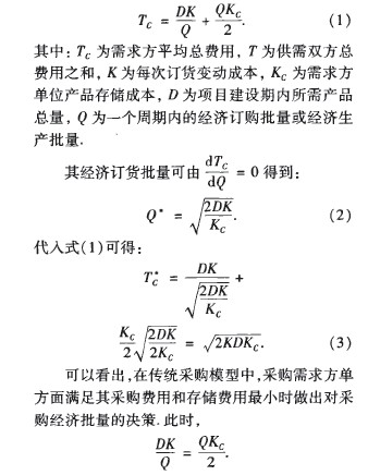 供應鏈環境下,采購方的經濟訂貨量與供應商的經濟生產量相同時,采購才是最經濟的.而在傳統的采購模式下,經濟訂購批量所考慮的僅僅是需求方單方面的訂購費用與存儲費用相同。