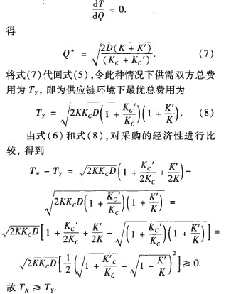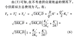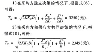 即供應鏈環境下決策時供需雙方總費用小于供需雙方各自單獨決策時所需總費用.說明只有在供應鏈環境下綜合考慮供需各方的總費用和效益才能保證整個供應鏈中的所有企業在長遠發展中取得最佳利益。