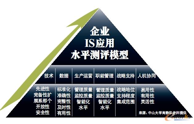 第二種是IT應用的水平評價。這種評價可以避免結果的滯后性和多因果導致的評估困難。中山大學謝康教授提出了IT應用水平評價體系,構建了企業IS應用水平測評模型,包括戰略、運作和基礎三個層面,技術質量、數據質量、業務運營、職能管理、人機協同和戰略支持6個維度,22個指標,對企業IT應用水平進行評價。