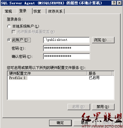 在Windows服務中,找到SQL Server Agent服務,在登錄選項卡中,使用步驟1中建立的用戶,如下圖: