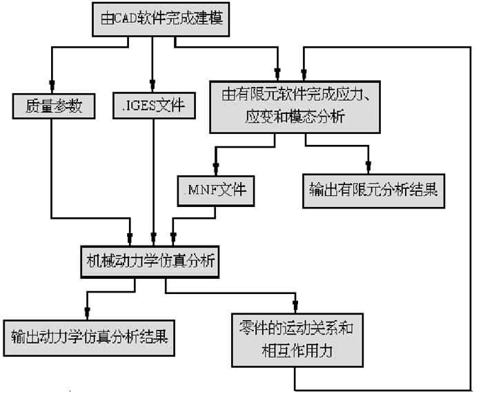 從以上的分析知道,要想更好地完成CAE任務,將CAE軟件與其他的CAX集成使用會獲得更好的效果。作為一個例子,圖2是實施這一集成的流程圖。這個例子中,首先由CAD軟件生成幾何模型,按.IGES格式或其他格式將模型輸出,然后由有限元軟件和機械動力學軟件分別讀入幾何模型。有限元軟件根據CAD軟件生成的幾何模型和機械動力學軟件計算得到的結點力完成應力、應變和模態分析并輸出分析結果。機械動力學軟件所需要的模型分成兩種類型:剛體模型從CAD軟件獲得;柔體模型從有限元軟件獲得(.MNF格式文件)。另外,如果某些零件的模型由機械動力學軟件自己生成,根據需要可從CAD軟件得到質量參數。機械動力學仿真分析除了輸出最終結果外,還可輸出零件的運動關系和結點力供有限元分析之用。