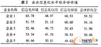 我們以東莞市被調查的部分中小型制造企業2006年各項指標為樣本,使用上述評價方法計算各企業的信息化水平綜合評價值,排名前5的企業得分情況如表2所示。